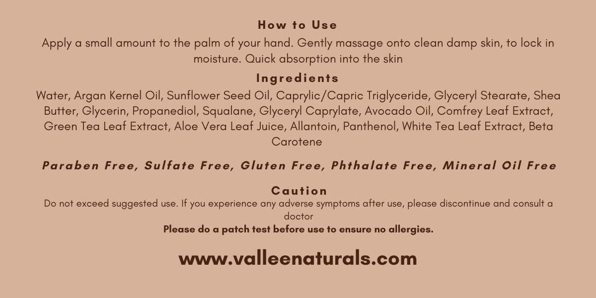 Water, Argan Kernel Oil, Sunflower Seed Oil, Caprylic/Capric Triglyceride, Glyceryl Stearate, Shea Butter, Glycerin, Propanediol, Squalane, Glyceryl Caprylate, Avocado Oil, Comfrey Leaf Extract, Green Tea Leaf Extract, Aloe Vera Leaf Juice, Allantoin, Panthenol, White Tea Leaf Extract, Beta Carotene